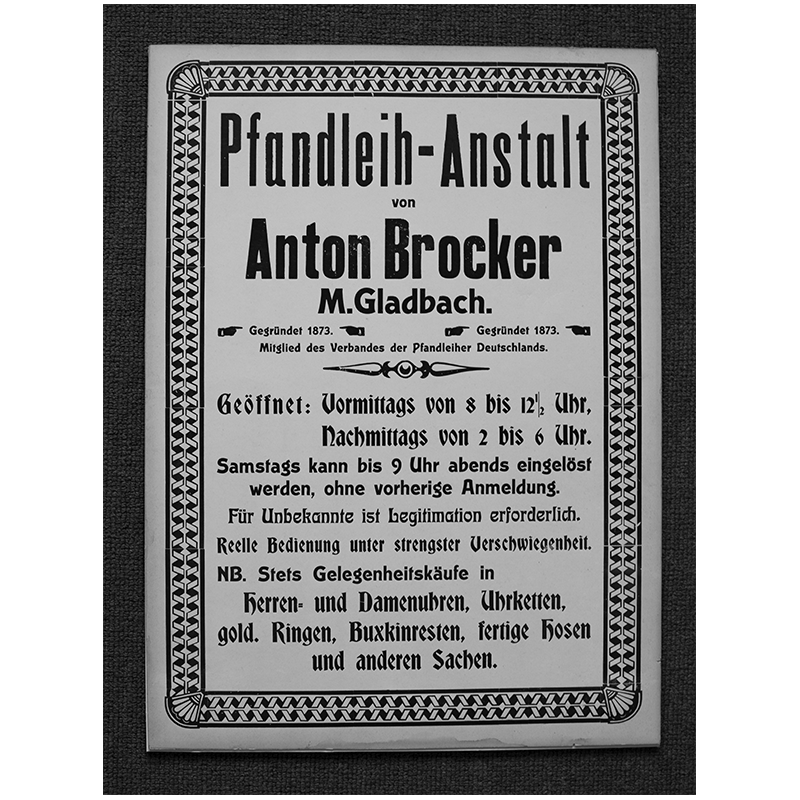 Das Pfandhaus Brocker wurde 1873 durch Anton Brocker gegründet und gilt so als eines der ältesten Traditionsunternehmen in Mönchengladbach und deutschlandweit.